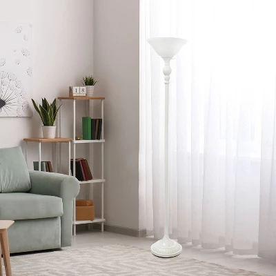 Light up your space with this simple but timeless torchiere floor lamp. It features a marbleized glass shade on a stunning metal base for a clean, sophisticated look. Perfect for your bedroom, office, foyer or living room. Item is sold in a number of finish options to ensure the right match is available.