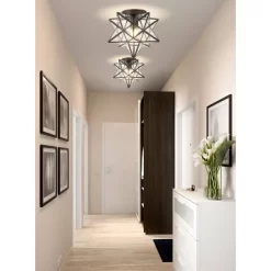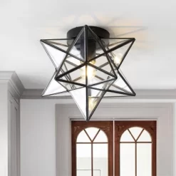 A European tradition dating back to the 19th century, Moravian stars like this one were displayed in windows during the days leading up to Christmas, but now have come to evoke a spirit of celebration year-round. Featuring an oil rubbed bronze finish and clear glass sides, this metal star flush mount is a dramatic addition to any living space. An eye-catching fixture, this pendant features an iron construction finished in bronze, framing clear glass panels to create its attention-grabbing star silhouette.