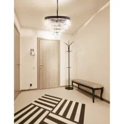 - Rectangular faceted crystal droplets adorn the canopy of this fixture