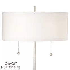 Two pull switches allow for easy control in this metal table lamp set perfect for a side or end table. The slim profile sits on a round base with an integrated USB port for charging electronic devices and a two-prong electrical outlet utility plug for other devices. White drum lamp shades complete the look.