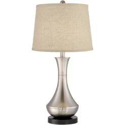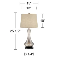 Charge a phone or small electronic device easily with the Simon table lamp set. The two matching table lamps feature a sleek modern design in a smooth brushed nickel finish. Topped with burlap drum shades.
