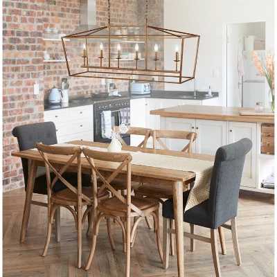 - An open lantern-style design gives this chandelier an air of hospitality.