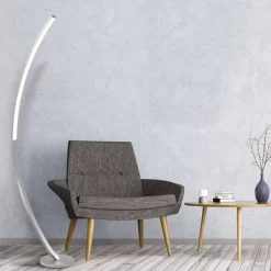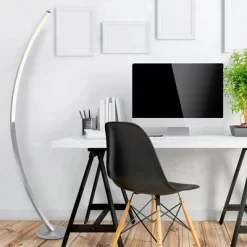 This transitional floor lamp features an arc-shaped body with a sleek, brushed nickel metal finish. The energy efficient integrated LED and frosted glass shade make this modern classic design the perfect addition to any room in your home. Whether placed beside a couch, in the bedroom, in an entryway, or in the foyer, this bold and dynamic design is sure to complete your space.