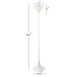 This unique silhouette and bright white finish instantly attract the eye and brighten any room. Stands tall at 69.5″ and features a convenient foot-step switch. A beautiful silk wrapped cord finishes the piece. Finished in white, the metal body and shade will suit any color palette. Beautiful to display or easy to conceal: the 72″ cord is silk-wrapped. On-off foot-step switch. Eco-friendly 9W LED bulb included. Takes one bulb and compatible with any 12W LED or 100W TYPE “A” or 23W CFL. UL Listed. Before cleaning any lamp shade or fixture, disconnect the power source. Wipe with a soft, dry cloth. Avoid the use of chemicals and household cleaners as they may damage the finish.