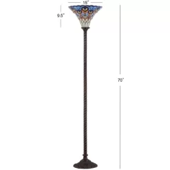 One of the finest techniques to come out of the Art Nouveau movement, the Tiffany-style stained glass shade on this torchiere floor lamp makes for a stunning addition to any space. While steeped in traditional design with it’s barley-twist base and peacock feather motif on the shade, this piece is updated with the functionality expected today — a step-on on/off button, LED bulb compatibility, and a beautiful silk-wrapped cord. Each shade is hand-made by artisans who specialize in the intricate art of stained glass soldering.