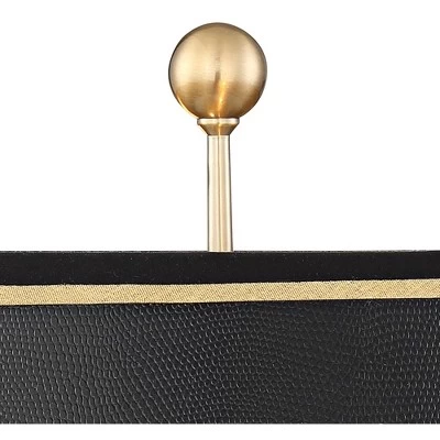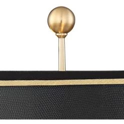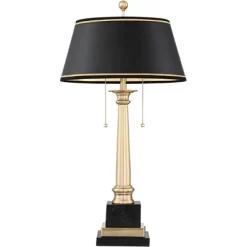 - Warm brass finish. Steel construction. Black marble accent on the base. Black shade with gold inside lining and outside trim.
