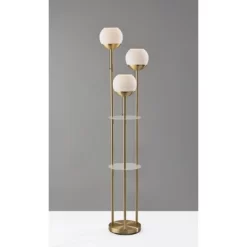 Bring a blend of style and function to your space with the 63″ Bianca floor lamp. Featuring two 10″ round frosted acrylic shelves, this lamp provides storage and display opportunities. The bottom shelf has a clearance of 34.75″, making it a perfect place to display vases, picture frames, or other taller items, while the 20″ clearance for the top shelf makes it ideal for placing drink glasses, phones, or other smaller pieces. The 10″ metal base with an antique brass finish makes for a sturdy design, while the three poles with an antique brass finish arranged in a triangular pattern rise cleanly to three lighting heads of varying heights for an eye-catching design. The three 7″ globe shades are made of white opal glass that complement the shelving and can be operated separately with pull chains, allowing you to control the amount of lighting. Each of the three globe shades ensconce 40W bulbs (not included), while the lamp also features a 5′ clear cord. The Bianca floor lamp is also available with a brushed steel finish.