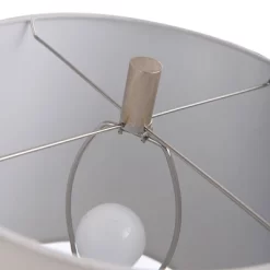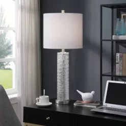 The Wembly table lamp showcases contemporary style in every element: the brushed steel base, the textured clear glass body, and the white drum shade. A simple color scheme, sleek design, and three-way functionality make this glass and steel lamp ideal for a side table in a family room or living room. The diamond textured pattern of the cylindrical frame stands out against the simple white shade and the smooth look of the brushed steel accents. This piece exemplifies superior product design and great styling. It will pair well with coastal styling. It will pair well with contemporary styling. Suitable for residential use in a dry location. Due to lighting and monitor differences, actual colors and finishes may vary slightly from what appears online.