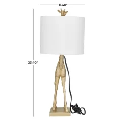 - An eclectic table lamp featuring a white drum-shaped shade supported by a unique and detailed gold giraffe polystone stand and a rectangular base