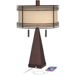 Franklin Iron Works Lucas Industrial Table Lamps Set Of 2 With Round Risers 27 1/2″ Tall Bronze With USB Nightlight LED Oatmeal Drum Shade For Desk