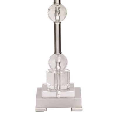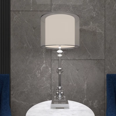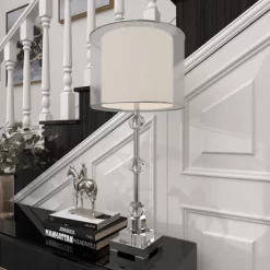 This silver table lamp provides a beautiful light source for your room. With its sleek design and finish as well as easy-on-the-eye light shade, this accent table lamp is the ideal addition to any setting. Designed with felt or rubber stoppers at the base that prevent scratching furniture and table tops, as well as sliding around. Requires 1 Type A E26/Medium (Standard) bulb. This item ships in 1 carton. Comes with a 65″ cord length. Suitable for indoor use only. Table lamp comes with a cream drum shaped shade that measures 14 x 14 x 9 inches. Includes a rotary switch. This is a single table lamp. Glam style.