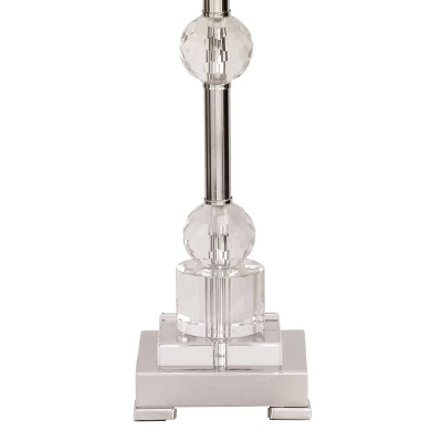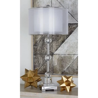 - Features glossy white drum-shaped shade and segmented lamp post with spherical glass accents