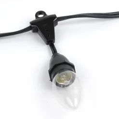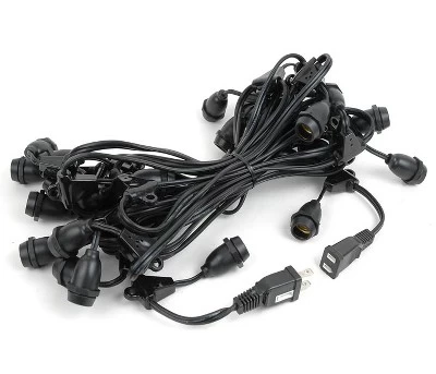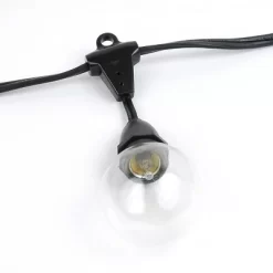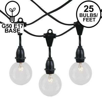Novelty Lights clear G50 intermediate base bulbs string light set with 25 bulbs on 25′ of commerical grade black wire. These are our most durable string light sets and are suitable for year round outdoor use and permanent lighting applications. Each set includes 25 G50 intermediate base bulbs on a commerical grade black wire stringer with 25 suspended sockets that are spaced 12″ apart. These clear G50 light strings have long-lasting 3,000 hour bulbs and are on a heavy duty 16 gauge SPT-2 black wire stringer. Each socket is made with PVC plastic to provide a water-tight seal and to ensure no defects due to weather. These durable and heavy duty light strings will provide you with years of maintenance free use. Perfect to use on any patio, restaurant, backyard, pergola, wedding venue, or town square for hanging outdoor string lights.