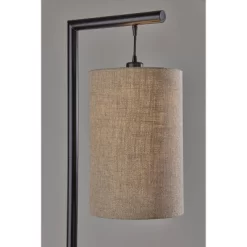 Add mid century style and ambient task lighting to your space with the Reggie floor lamp. At 65.5″ tall and with a slim stem, this space-efficient lamp fits conveniently in corners or behind or beside furniture. With a black metal finish, the base forms a low triangle shape leading to the thin stem. Hanging by a short cord covered in black fabric is a tall drum shade, measuring 15″ tall and 10″ in diameter. The light brown textured fabric diffuses the light from a 100W bulb (not included), softly illuminating your room. The lamp is operated by a rotary socket switch and is powered by a 6′ cord covered in black fabric. This table lamp is also available with an antique brass finish. Complete your décor with the coordinating Reggie table lamp.