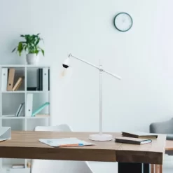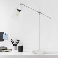 Practical and elegantly designed, this desk lamp can move up and down to the exact height in your home OR office to properly lighten up your space! The base of the lamp is smoothly finished and paired with a clear glass shade to optimize the light output you seek. Available in a variety of finish options, you’re sure to find the complimenting piece for your living room, office, or bedroom.