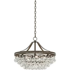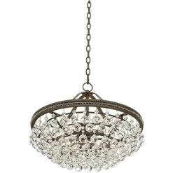 - Bronze finish frame and canopy. Metal construction. Clear round hanging crystal accents.